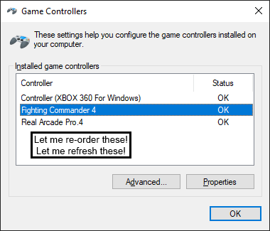 The controller manager in windows sucks horribly. You can’t reassign controllers from it, you can’t forcibly refresh the list of controllers to check what’s available, you can’t rebind buttons or bind buttons to keys from it. And controllers frequently end up in the wrong slots, or don’t let go of their slot properly when disconnected. I’m a primarily PC gamer and I play fighting games with tons of friends, so I’ve dealt with these issues on a recurring basis and frequently have had to outright give up on getting controllers to run.
