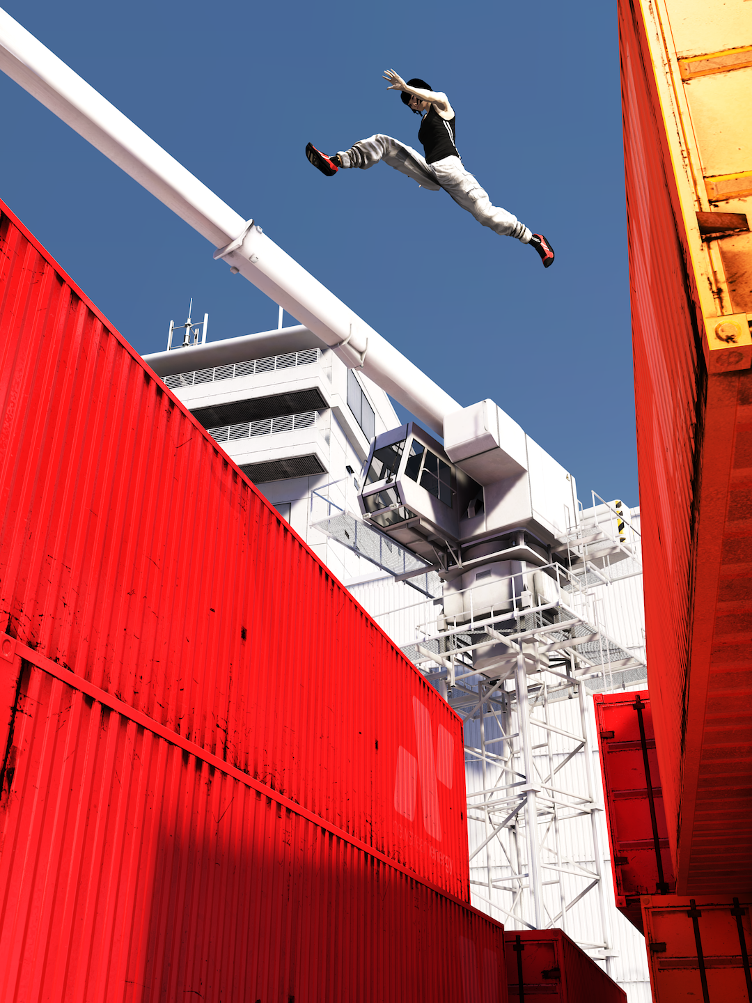 The big star of the run in Mirror’s Edge is really the kick glitch, because it’s simultaneously so situational, but also incredibly powerful and flexible. You can only use the kick glitch when there’s a flat wall pointing out into open air, which means unless you’re jumping across gaps, there isn’t an opportunity to use it. This helps keep the fastest form of movement constrained to just crossing gaps instead of dominating the whole run.