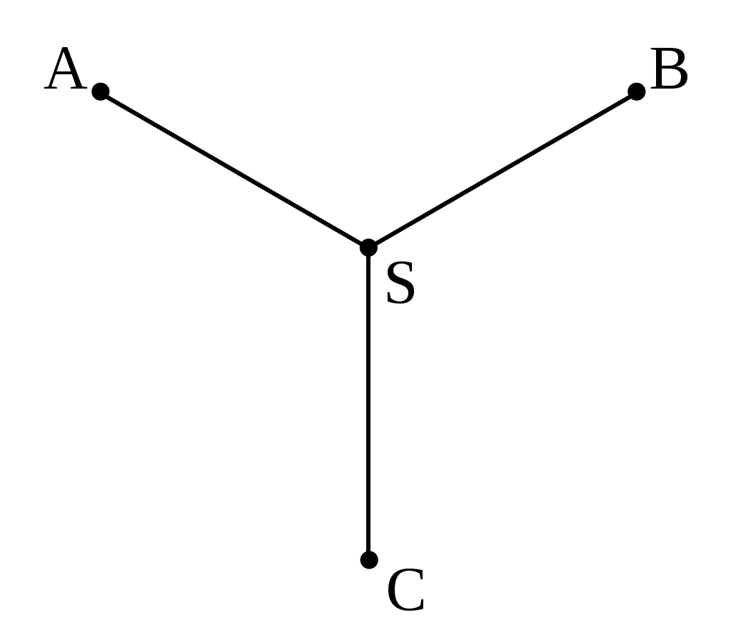 The Steiner point marked as S, the point with the minimum distance between multiple points, sits between all the other points of interest, and minimizes travel time between them. In real life we see college common areas designed like this, because they simplify navigation, but in an exploration game, we typically want navigation to be more complex.