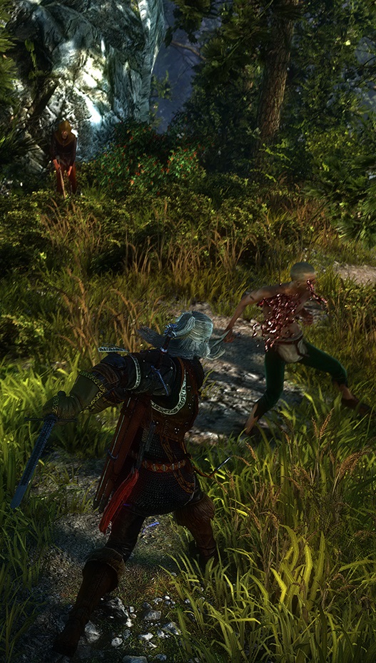 Instant kills are implemented extremely sloppily in Witcher 2. When an enemy is dizzied for an instant kill, the camera cuts away to an empty version of the scene where Geralt does a finisher move. The weird thing about this is, the enemies around Geralt are not paused while this is happening, and will continue to move and fight invisibly around him. Very frequently this means cutting back from the instant kill to instantly have a monster’s claw in your face before you can block or dodge.