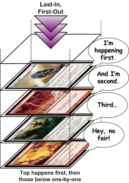 Another popular data structure that is common to card games is the Stack data structure, which Magic The Gathering calls out by name, and Yugioh refers to as a “chain” (and Yugioh also prohibits things from being added to a chain once it starts resolving, whereas magic is content with letting the stack build up and deplete and build up again before completely resolving). In both games, you’re allowed to activate certain effects during your opponent’s turn. These get added to a stack or chain in a “first in, last out” order. That means you’re allowed to react to your opponent doing things with actions of your own, and those will resolve before the previous effect. So, your opponent might cast a spell that destroys your creature, but you can react with one that makes your creature indestructible. From there, the stack resolves the last thing added to it: Indestructibility, and then resolves the destruction; which fizzles due to the creature being rendered indestructible first. Magic even has cards that change the stack into a queue, meaning spells resolve first-in, first-out, making interaction very difficult.