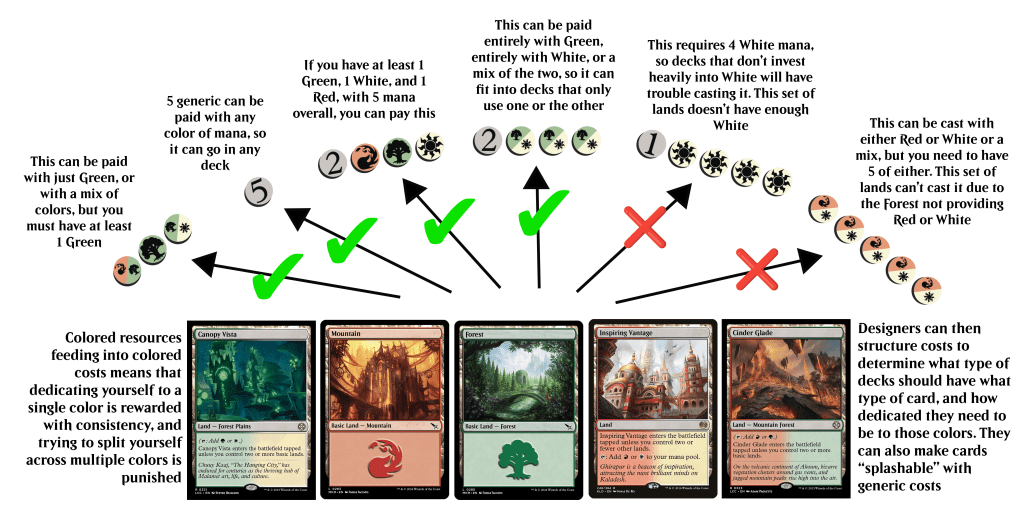 Magic the Gathering also makes costs more granular in that each spell can cost different amounts of colored mana or generic mana. This allows Magic to reward decks that focus on single colors with more consistency, and creates a basic system of requirement before a spell can be cast. A spell with a single colored pip requires a mana source of that color and thus can be splashed easily into other color decks, whereas a spell with many colored pips requires many mana pips of that color, and thus can’t be run easily in a deck that isn’t willing to commit.