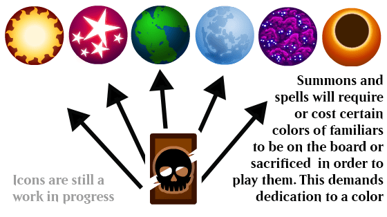 I do have a color system in place to avoid some of the homogeneity of early Yugioh, but it’s entirely possible that the metagame will converge on whatever familiars generate the best value, or simply have the highest attack power for a given number of sacrifices, much like MTG and early Yugioh. This means I’ll probably have to tie value engines to synergies, and need to be very careful around cards that simply have a sacrifice requirement and nothing else. And I’ll need to be very careful to keep these synergies weak enough that they don’t solidify into archetypes like the Yugioh and Digimon TCGs.