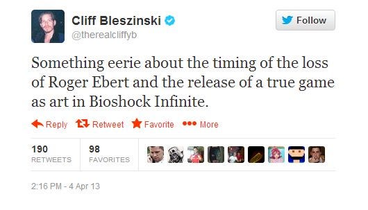 And this is recurring. What game did people try to tell Roger Ebert proved that video games were art? Shadow of the Colossus. There are plenty of other contemporary examples, like Bioshock, or Paper’s Please, or Cart Life, or so on. Cliff Bleszinski left us with this gauche statement in 2013 about Bioshock Infinite:
