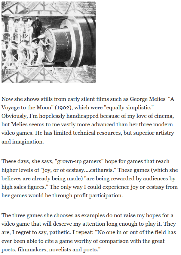 You can see that it’s evoking the line said in movie trailers. You can see the letterboxing applied to the image, intended to evoke the way films are letterboxes to preserve their aspect ratio, which evolved into a part of the language of cinema, where increased letterboxing indicates to the audience that a scene is meant to be taken more seriously. And that’s how you get this type of nerd peter pan syndrome, demanding to be taken seriously about this medium that finally “grew up”. Not secure in knowing that games are art, they demand that critics like Roger Ebert, one of the best known film critics of our times, take games seriously in the same breath as enduring works of literature and cinema. This is insecurity that demands prestige.