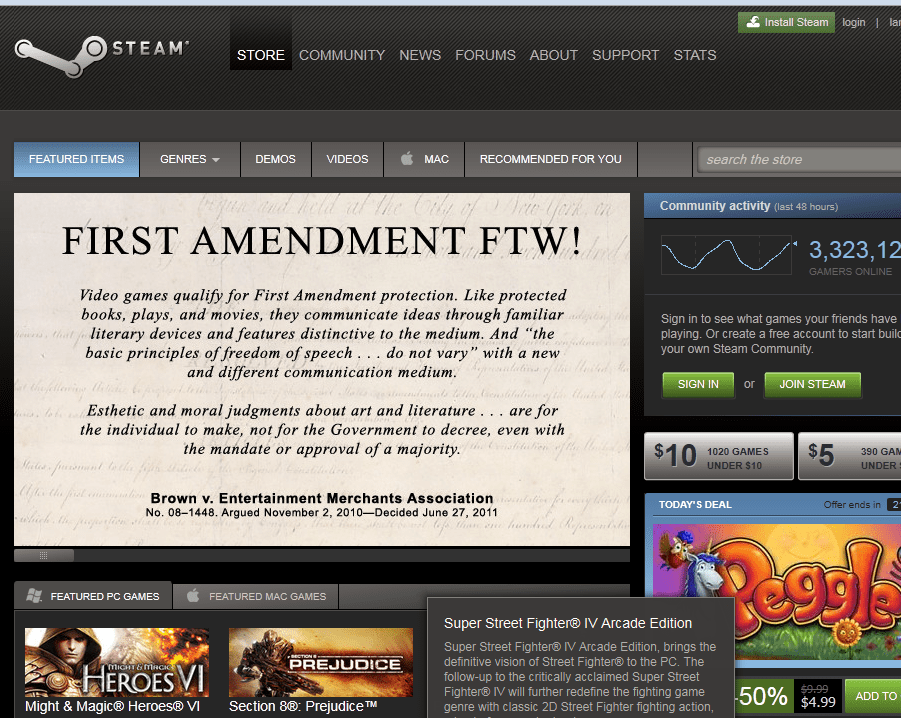 We saw this aping of cinema replicate itself in 2015 with The Order 1886 (5 years after Ebert’s article on how games will never be art), a game that touted itself as “filmic” and “cinematic” in its marketing, and went as far as to limit the aspect ratio for the entire game. Of course, this game has been utterly forgotten with time, because it was a 3rd person cover shooter that didn’t do much of anything to stand out from the deluge of other 3rd person cover shooters in its time. Games have had an envy of film that has manifested itself over and over again. Games try to prove themselves by copying an art form that they see as respected. When a first amendment ruling on the status of video games as free expression was made by the US Supreme Court, the Steam storefront displayed this on their front page: