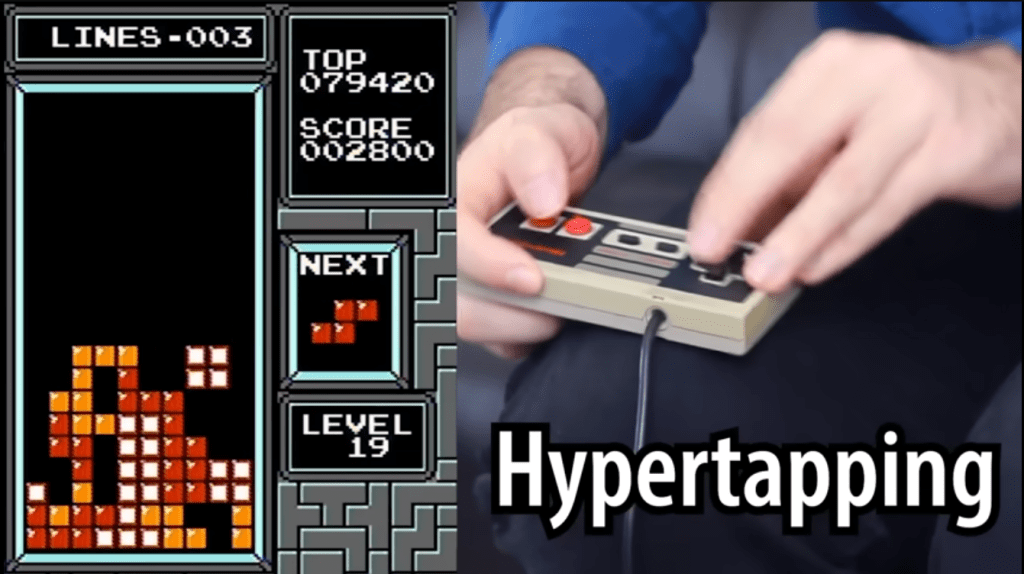 NES Tetris moves pieces faster when the dpad is mashed rather than held, so players have devised a variety of methods to mash the dpad as fast as possible to move pieces into place at higher speeds, such as using your index fingers to mash faster (called Hypertapping) and mashing on the back of the controller while holding the thumb in place (called Rolling).