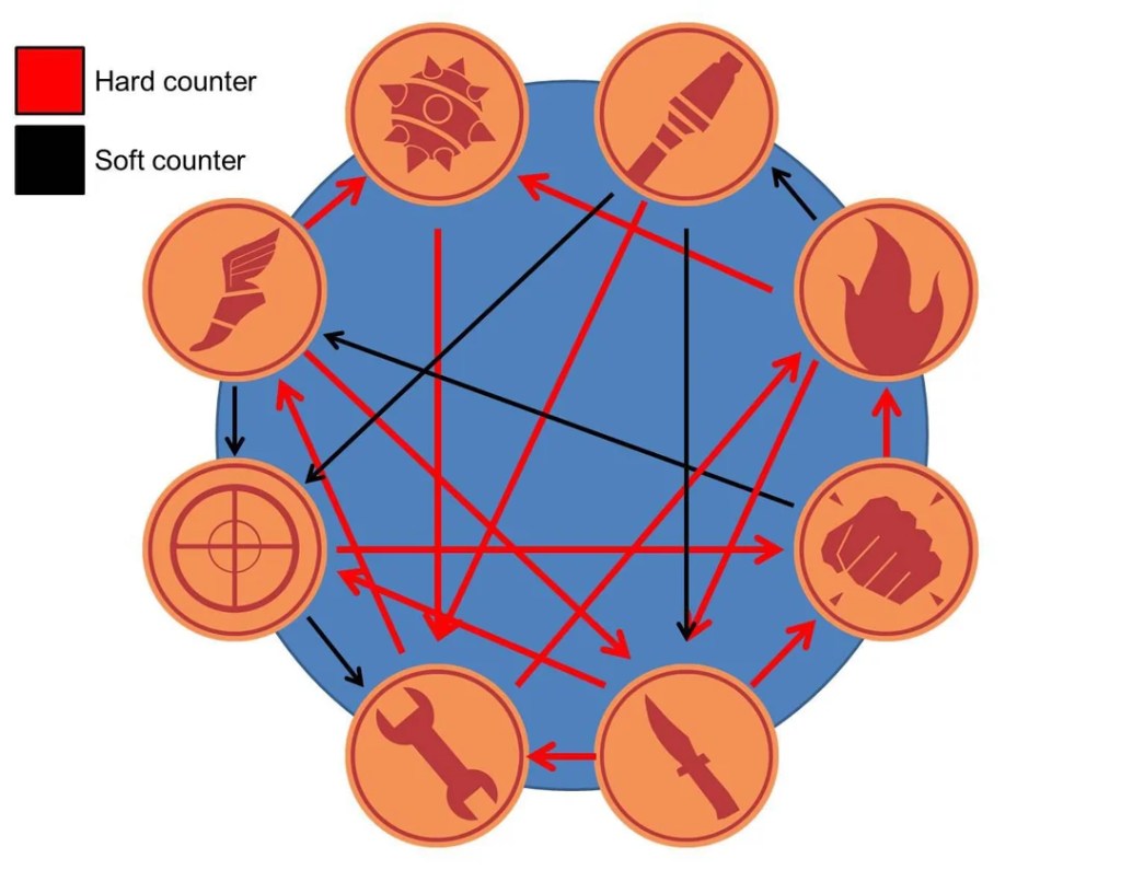 I’m not trying to suggest here that softer counterplay is inherently better. A game with very soft counterplay can end up like a weird mush where nothing really beats anything. A game with very hard counterplay doesn’t care a lot about situational factors and boils down to simply which option you select. Depth is created through differentiation, and that includes differentiating between harder and softer counters.