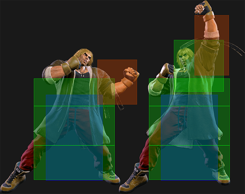 Street Fighter 6, interestingly, decided to combine both of these approaches by marking the upper body hurtboxes of the character performing the anti-air move invincible to air attacks. This means that they’re a somewhat soft counter against jump-ins, but also that they cannot be used in neutral to beat poking attacks, making a more narrow soft counter, instead of choosing between a wide soft counter and a narrow hard counter. Notably, this does mean that anti-air moves in SF6 are a harder counter to jump-in attacks than they were in prior games. This is a subtle touch to add consistency to an interaction that wasn’t very consistent in Street Fighter 5.
