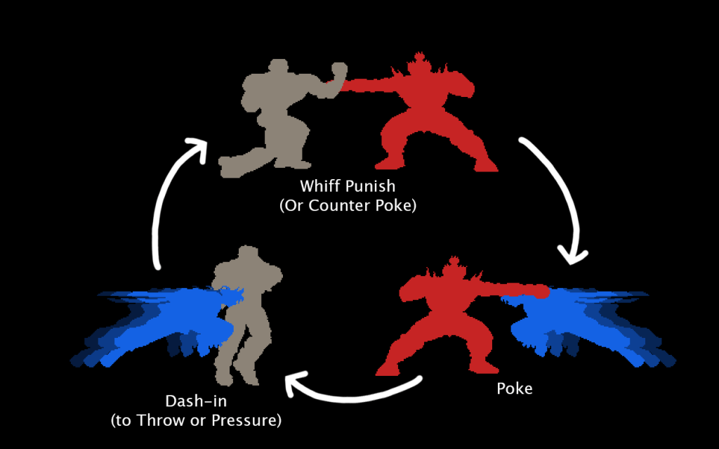 I’ve made a video explaining a lot of these rules in more generalized terms. What’s important is, fighting games tend to have fairly soft RPS. You can win with just one button if you never press it at the wrong time. Distance and Time act as modulators for the RPS of fighting games, so different moves are more likely to win at different distances, and moves can win or lose depending on how fast they are, or what time they’re used.