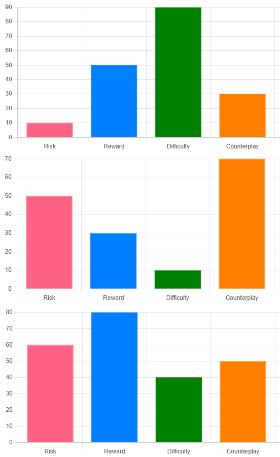 A subtle factor of this model is that cost is a type of risk, and therefore something you put at Stake. When you pay a cost, you’re risking that that investment won’t pay off. Therefore An upside of this model is that it separates Risk from Difficulty/Chance of Success, which are often conflated. “This move is risky, because you’re likely to mess it up.” By separating Risk out into Stake, Difficulty, and Counterplay, we can think more carefully about how each of these different factors play into an option’s design, and we have a wider design space for option design.