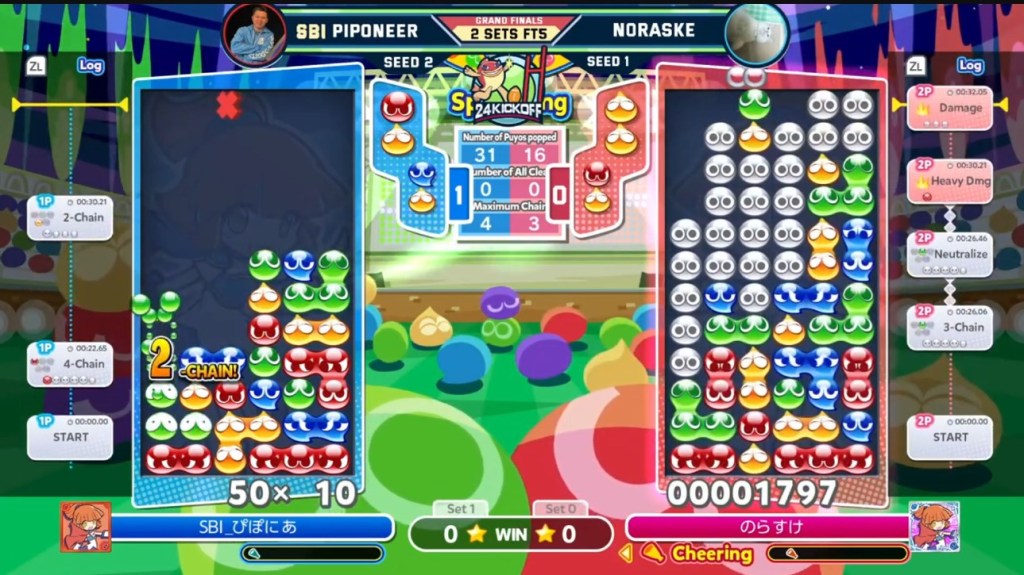 The logs on the sidebars indicate when players sent junk to each other, how much, and whether it was countered.