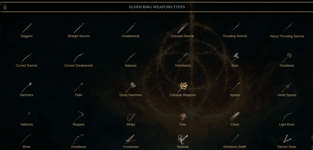 We can see design space applied in the traits of different weapons, spells, enemies, and obstacles. Each game has a roster of weapons, with unique animations and stats. They can be faster or slower, cover wider or narrower areas, scale with STR or Dex, deal more poise or less per-attack, and knock down smaller enemies on certain attacks too. From Soft have created all of these different possible weapon traits for their design space, and then fleshed that out into discrete content.