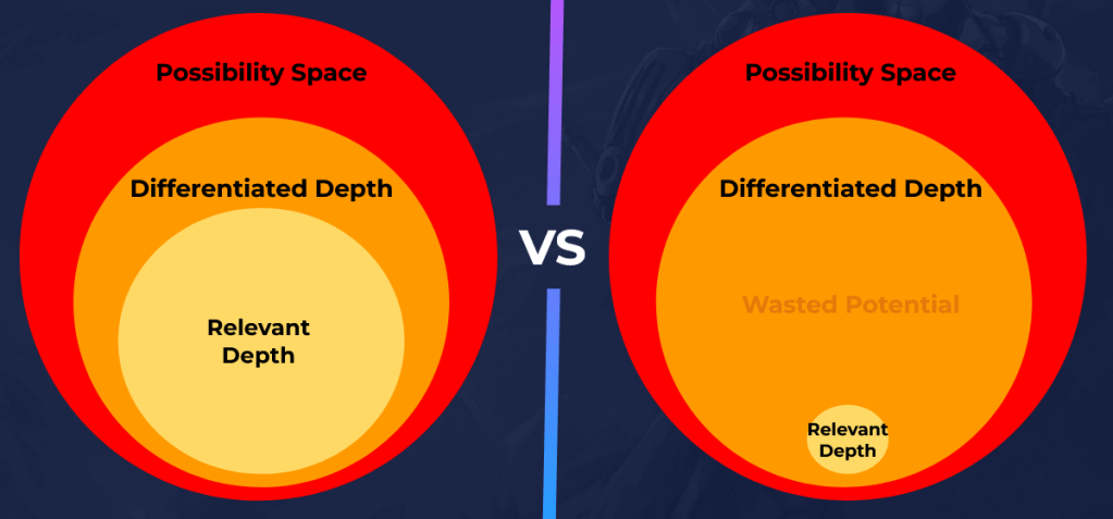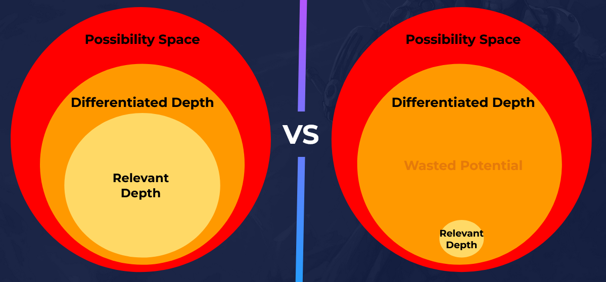 Relevant depth is created when there isn’t a clear answer as to which of these is better, when there is tension between conflicting priorities and relevant depth collapses when there is a clear winner, an optimal strategy. The possibility space and absolute depth expands as more and more intermediary solutions or situations between these two (or more) extremes are created.
