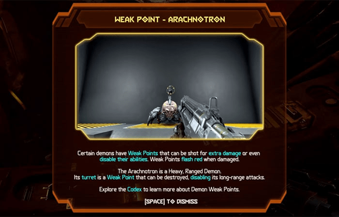 Ironically, Doom Eternal has a fairly compelling dialectic between shooting weakpoints versus taking an enemy out completely, but because they have these little tutorial pop-ups, many players simply took it for granted that the optimal way to play the game was to always target enemy weak points, rather than seeing it as an interesting choice. This lead many players to see Doom Eternal as a kind of rote and rigid game, when they could have experimented and paid attention to find that it isn’t.
