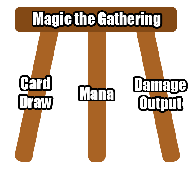 Therefore, having multiple of these priorities active at once is a good recipe for creating a compelling and dynamic game. You want to create a three-legged stool. In Magic the Gathering, you have this kind of 3-legged stool. Different decks tend to prioritize one of these 3 goals: Winning Fast (Red), Drawing Cards (Blue), and Ramping (Green). Different decks will mix these components to achieve different strategies, such as a blue-green deck that aims to draw a bunch of cards and ramp a lot, accumulating an overwhelming amount of value, then overrunning the opponent, but they might go too slow to stop the opponent’s win condition. Blue-Red might try to draw a bunch of cards to assemble a fast win condition, but get constricted on having enough mana to win. Red-Green might ramp to power out hasty big bodies in order to win in an overwhelming way at the expense of not having any cards left to play. There are many other ways to mix these components together, such as interaction, denying your opponent the ability to perform one of these functions, or paying the cost of enabling your opponent to perform one of these functions (like countering a spell, but letting them draw a card, or paying life to draw cards, enabling your opponent to kill you faster).