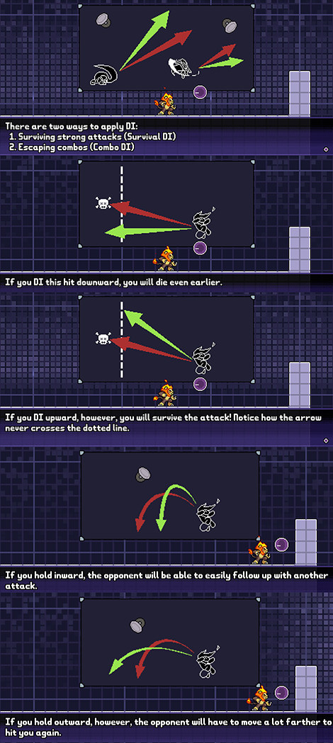 Smash Bros is superb at creating this tension in its combo system, because an important tension is baked into how the combo system works: Survival DI vs Combo Escape DI. A player can either try to escape their opponent’s weak hit, or survive their opponent’s strong hit. Both the attacker and defender are simultaneously making choices on each hit of the combo that dictate what could happen next, balanced between different priorities. Plus, the knockdown, recovery, and stage layout systems create a lot of variability (possibility space & absolute depth) in advantage and disadvantage situations.