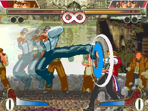 KOF also introduced the hop, a low-to-the-ground jump. This lets you do overhead attacks on grounded opponents more quickly, with the downside that you won’t evade their standing attacks or fireballs. Hops are usually triggered by tapping up, then releasing it before the pre-jump squat animation completes.