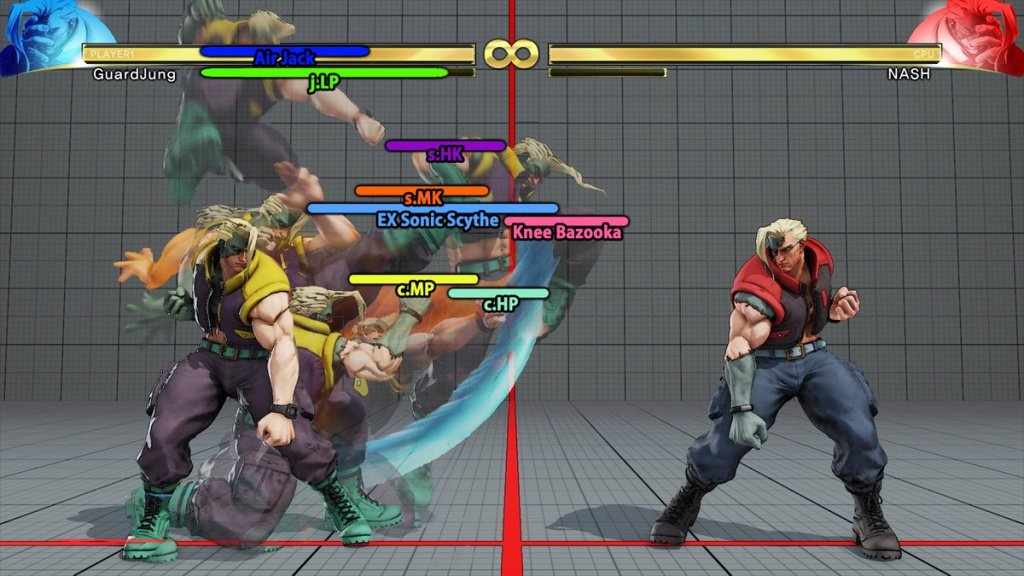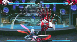 Next is whether the game has a chain system, and determining which moves can be canceled. If the game leans more towards the street fighter end (No double jumps, no airdashes) then moves tend to have more restrictive chains or not chain at all, and frequently. If it leans more towards the anime fighter end, then try looking for chains by pressing buttons from light to heavy as they connect with your opponent. See if you can cancel your sweep into a special attack, this tends to be a barometer for where the game falls in terms of crazy combos.
