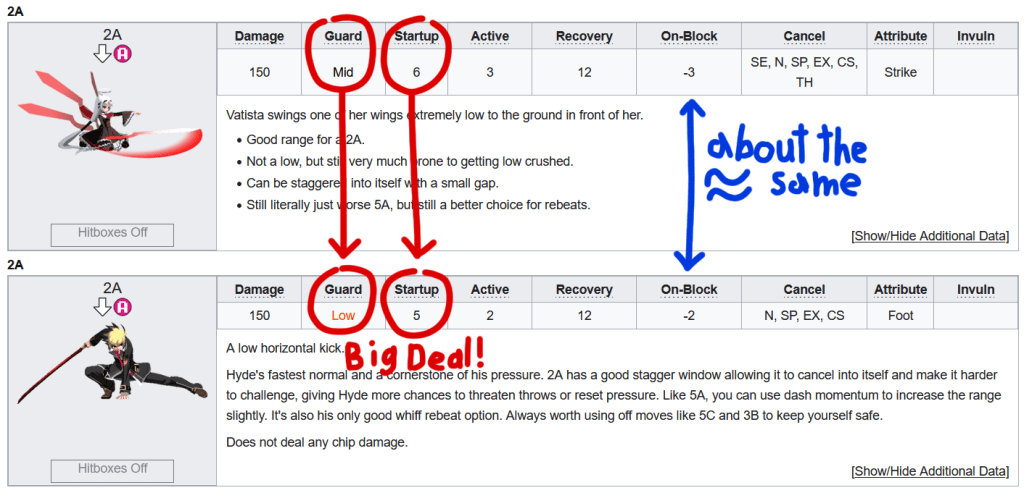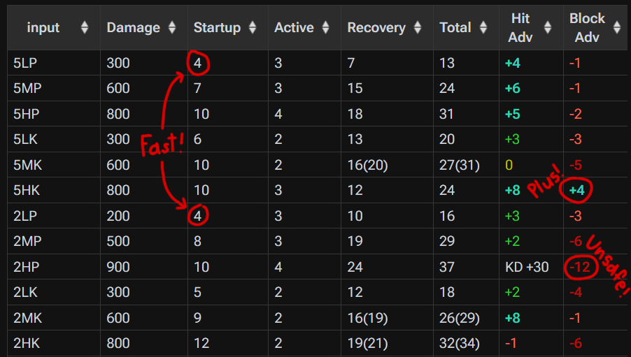 An important thing to do here is also to check your character’s frame data. This is incredibly intimidating to a lot of players, because it looks like memorizing a big table of semi-arbitrary numbers. In practice, that’s not actually the case.