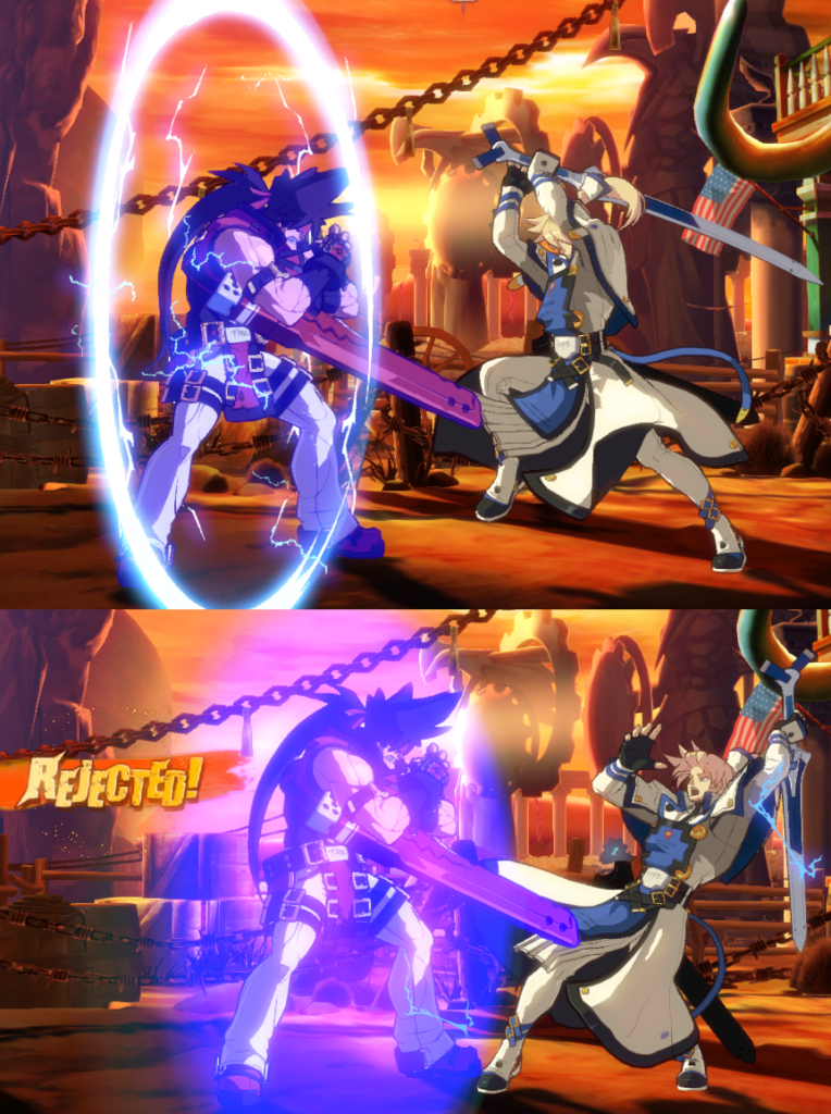 Universal defensive mechanics can be trickier to work with. One of the most common and easiest to use is Pushblock. This can take the form of either pressing a button when you’re in blockstun (MVC3, Darkstalkers, Under Night), or holding up a shield that increases the pushback for your opponent (Guilty Gear and Blazblue). Many shield style mechanics also have the benefit of negating chip damage, which can be helpful against super attacks. Pushblock frequently has the side effect of extending blockstun, so it can create new pressure opportunities for your opponent in some matchups.
