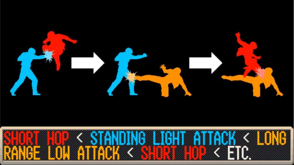 The design principle here is that when you’re up close to someone, you can hit them with plus-frame moves that let you mix up between strike and throw, creating the basis of pressure. Each move you hit with steadily pushes the other player away, which means only your slower and lower frame advantage moves have enough range to still hit the opponent, ceding your turn over to them.